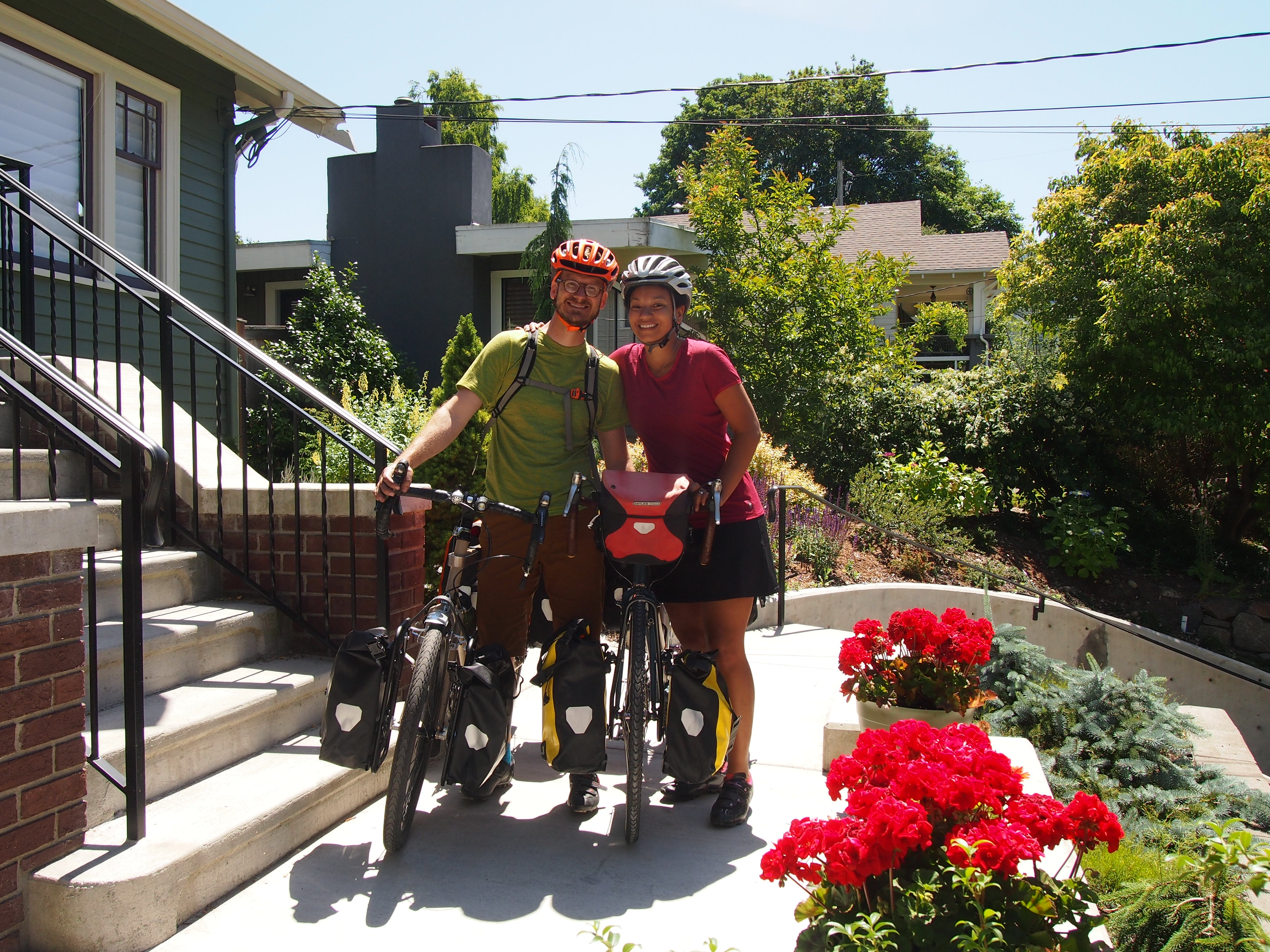 We’re calling the first day on the bike “Day 0” because we spent more time dealing with logistics than actually riding. We arrived to Seattle on a red-eye from Kona, HI around 6:45a. Ted got about 2 hours of sleep and Dani estimates that she got between 3 and 4. Needless to say, we got off to a bit of a groggy, grumpy start. We navigated a confusing modified public transportation schedule (due to a marathon) and arrived around 9a to a colleague of Dani’s dad’s house to assemble our bikes, which the colleague graciously received and stored for us. Our bikes were relatively unscathed after the cross-country FedEx trip, and Ted expertly threw them back together using fancy bike-throwing-together techniques Dani doesn’t understand.