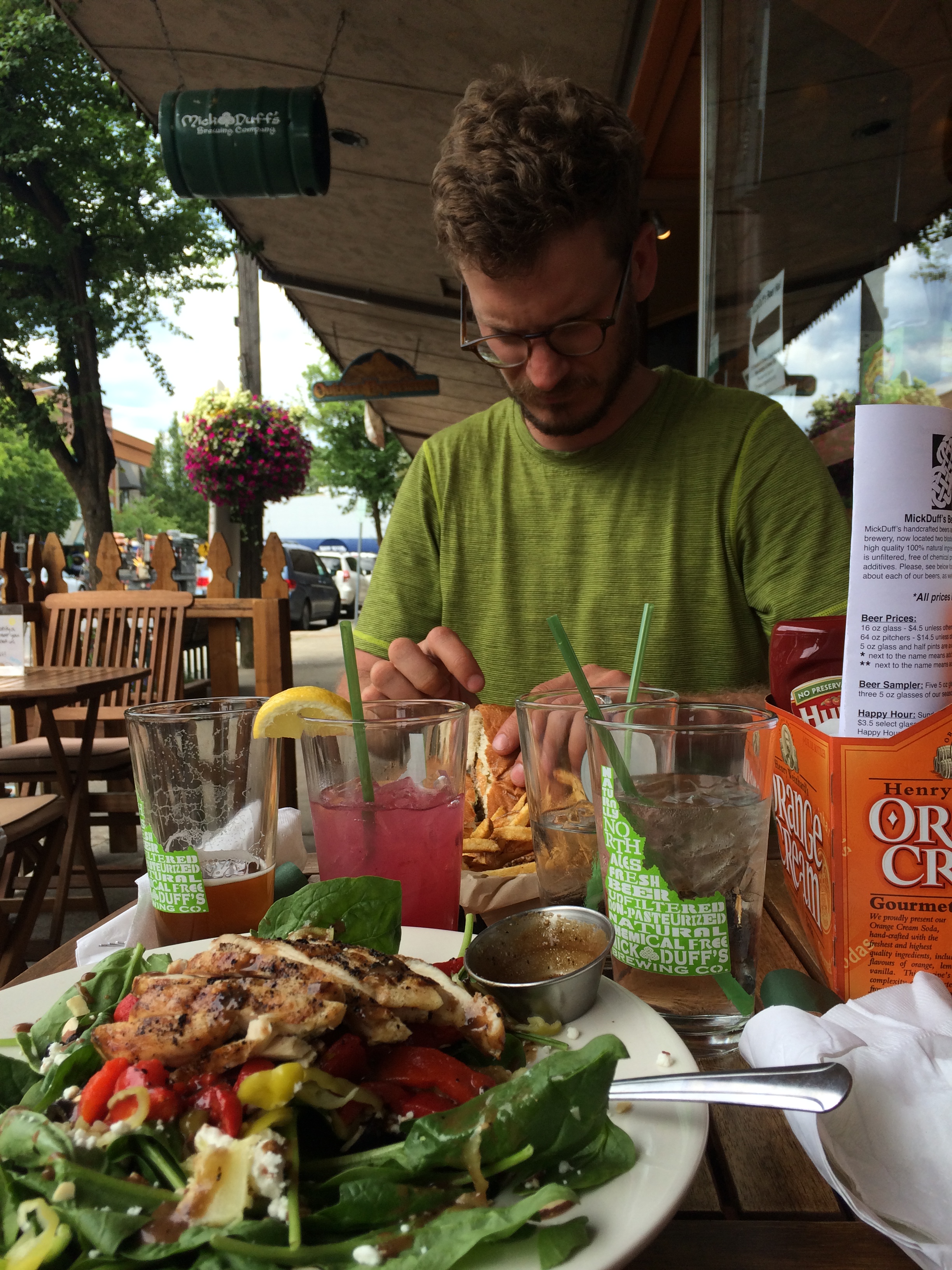 We arrived in Sandpoint, ID around lunch and even though I had my heart set on Jack-in-the-Box (because I saw a Jack-in-the-Box hamburger box on the side of the road so I figured there must be one in Sandpoint, the only large town around, and I need some sort of food item to fixate on to get me through to lunch), when we saw how adorable Sandpoint was, it seemed sinful to visit a chain. So with our first (single bar of) T-Mobile service since Sedro-Woolley, we Yelped and found Mick Duff’s Brewing Company. We shared a burger and fries and a grilled chicken spinach salad, Ted ordered their IPA, and I ordered huckleberry lemonade because all I ever want these days is fresh-squeezed lemonade. Everything was delicious.