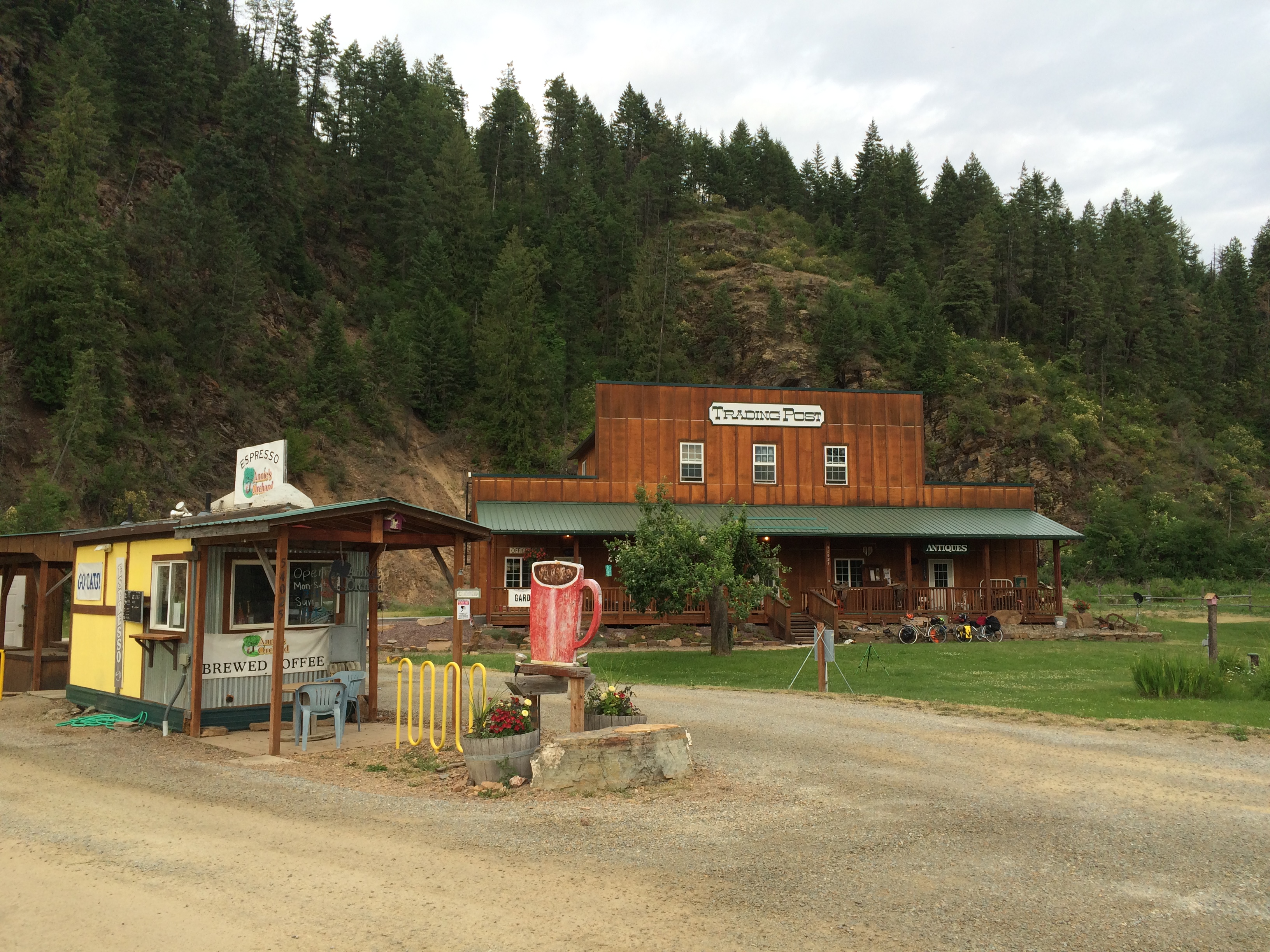 After a relatively uneventful and fast 28 miles we arrived at Annie’s Orchard, a family-run apple orchard, trading post, espresso shop, and garden center in Clark’s Fork, ID that allows cyclists to camp in their orchard and use their restroom and wifi. A godsend! This place and its proprietor, Terry, are wonderful and we feel so grateful to experience a little more friendliness on the road. Terry, who lives across the street, even sent his daughter over with a large pile of freshly picked raspberries!