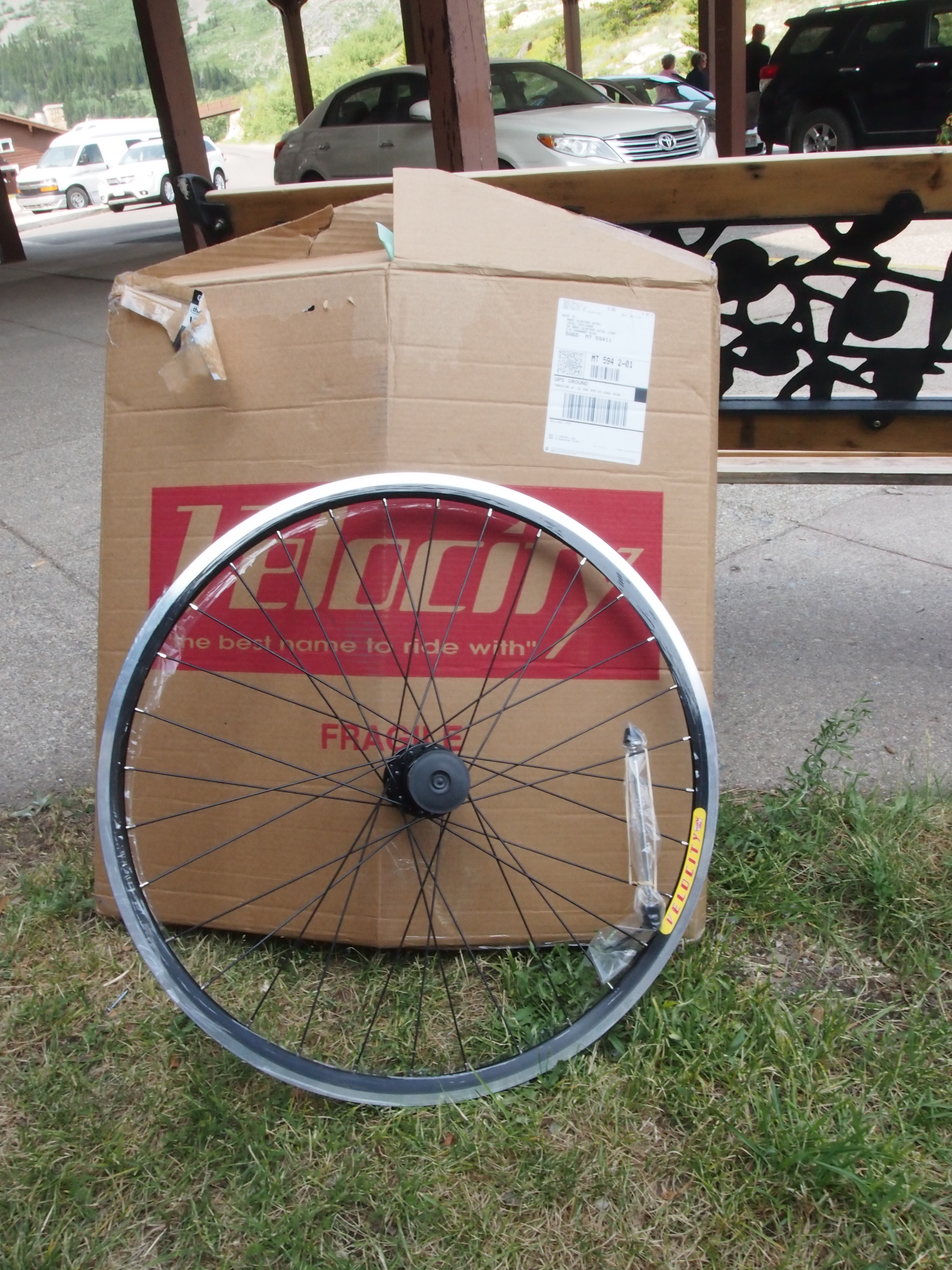 The big day! It was a pretty stressful morning and early afternoon. The wheel made it to a town two hours away at 7:15a, and then there were no further tracking updates. I would walk up to the inn every half hour or so to check, and each time I was more and more convinced that we would end up spending another day at the campground. But when I checked at 3:00p, it was delivered! In shocked disbelief, I rushed to tell Dani and we hurriedly broke camp and packed up our bikes. We rode the mile down to the hotel to get the wheel. All that was left was installation.