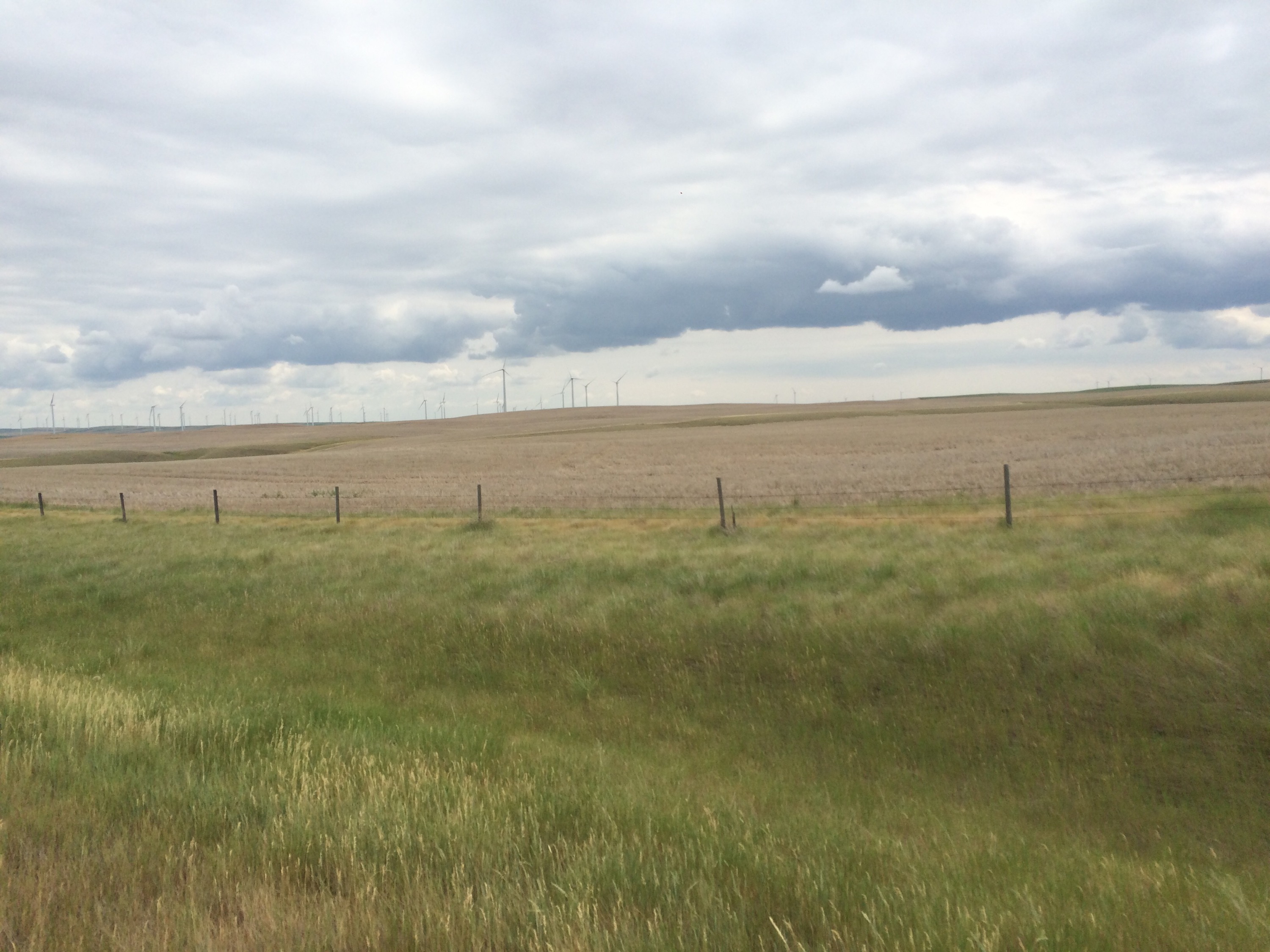 We stocked up on Snickers bars, jerky, and fruit at Alberson’s, then headed out for our last 24 miles, which were easy downhill with no wind. We were both surprised by how much we enjoyed the scenery. All of the green and yellow grass tones, gentle rolling hills, and an overcast sky made for a different, unexpected type of pretty. I’m sure it will get old, but I’m glad we enjoyed our first day in plains, at least. Ted’s knee hurt all day, though, so we need to be careful not to push it too hard as we try to make up time.