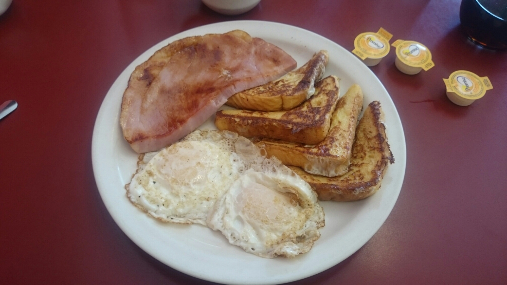 We woke up from a deep sleep (beds!) at 5:30a, but couldn’t manage to get as early of a start as we aimed for, leaving around 6:30a. We were greeted by a small hill out of town, but then flats / downhills / small rollers for the next 40 miles into Chester. We beat our previous cycling without stopping record by 10 miles, cycling for 27 miles nonstop. We made it to Chester, 42 miles in and 2/5 of our total ride by 9:45a and decided to treat ourselves to breakfast at Spud’s cafe. I got a delicious, sloppy skillet meal and Ted got the Hungryman breakfast, which included, among other things, a giant ham steak.