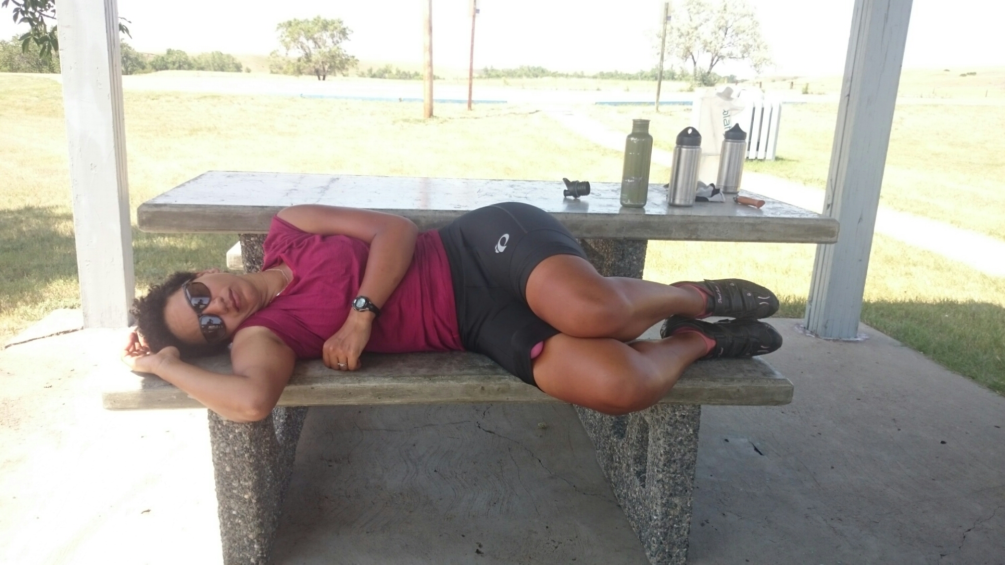 After 17 miles of rolling hills, we made it to Sleeping Buffalo, a sacred rock that I wish I could tell you more about, but I can’t because the moment we stopped there we were swarmed by mosquitoes. It was like something out of a Loney Tunes cartoon. We immediately applied our bug spray–our cruelty-free, all natural, citronella-based bug spray–and the mosquitoes didn’t give two craps about it. They were flying through the bug spray stream in search of blood. It was an ambush.