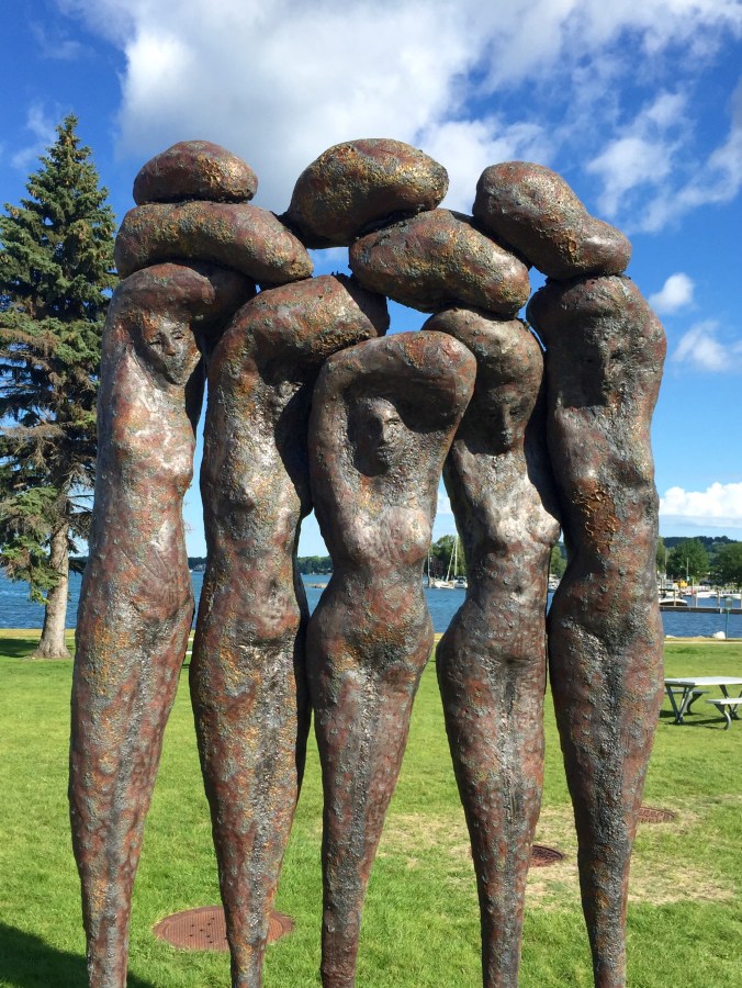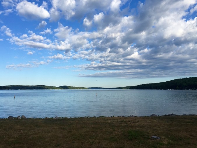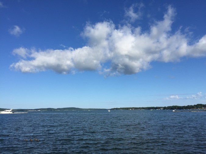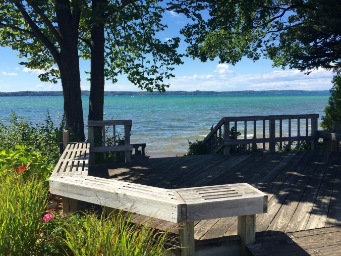 That man was right. Nineteen miles of trees and people’s driveways to their lakefront homes. No water views. Alden was beautiful, though, and we ate at a restaurant called Mama’s Country Kitchen because they were having a Friday fish fry! We’ve heard about Friday fish fries since Fargo, but have never been in the right place at the right time to experience one. We each ate seven large pieces of cod, fries, and Ted ate coleslaw. We were stuffed and reluctant to start the second half of our day. After leaving, we stopped to take one last sit by Torch Lake before pushing on.