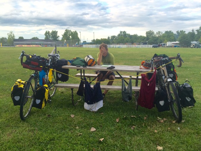 Then we packed up the groceries and pushed on. We were feeling pretty good after 95 miles, but we still had 20 more miles to make it to our campground. Round about mile 108, our energy levels tanked. It was also around this time that we realized that the first campground on the map didn’t accept tent campers, and we had an extra three miles to bike. Three miles has never seemed like such an insurmountable task. And why would a campground not allow tent campers? Is there really that much money in seasonal RV campers that you can turn your nose up at a few bucks every now and again at a tent? I guess so.
