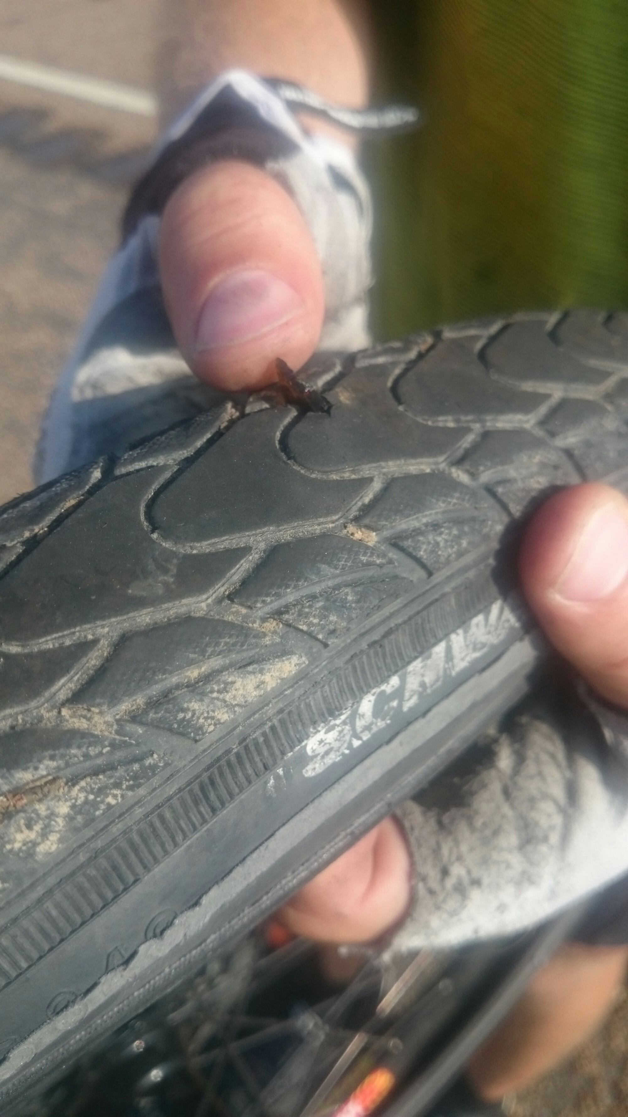 We were cruising along, making excellent time to Medora, when I heard Dani’s tire pop from a good 20 yards behind her. She had ridden over something nasty that sliced right through the sidewall of her tire. For those of you who don’t know, a gash to the sidewall is a death sentence for the structural integrity of a tire. Luckily we a) had a tire boot to use as an emergency fix (my bike tool kit is really getting some use!), and b) were close to Medora, which has a great bike shop. While we were changing the tube, a man named Chuck stopped to offer us help! He owns a bookshop in Seattle and is also riding across the country with his wife driving a support car. He was in the support car because his tire blew out in Vida and he had to go all the way to Medora to get a tire. He’s not going to cheat, though. His wife will drive him back to Vida to cover that section again.