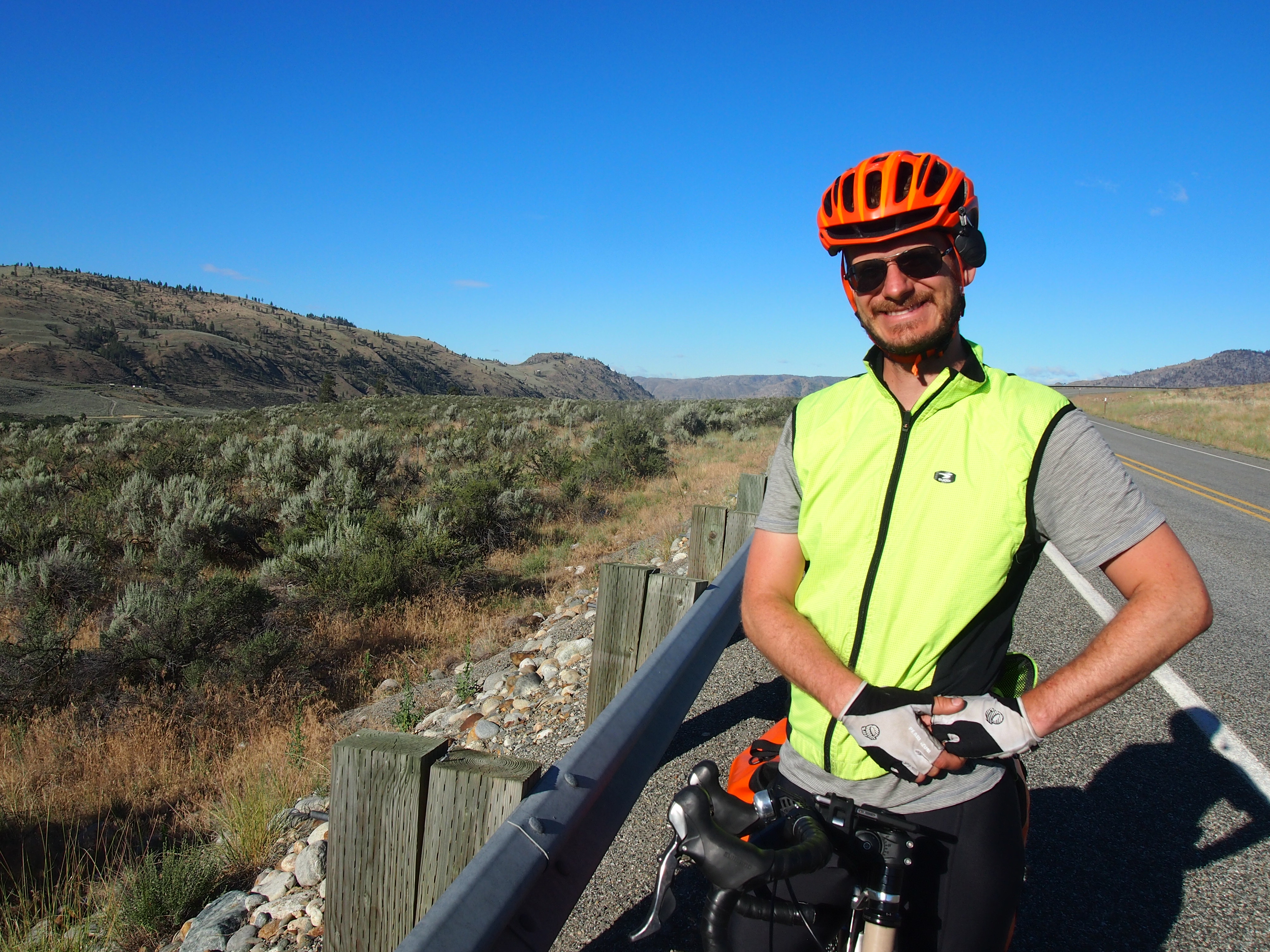 Ever since coming down from Washington Pass, the landscape has changed dramatically. We passed through the dense, lush forests of the west side of the mountains, and we are now moving into the high desert climate of Central and Eastern Washington. We’ve been riding through ranchland and farmland, where bright green patches of irragated fields jump out from the surrounding brown terrain. We also passed by thousands of acres of apple orchards, sometimes with hundreds of acres entirely covered in mesh netting to keep the birds away. And it has become exceptionally hot. The temperature over the last couple of days has been over 90 degrees. I really enjoyed riding through old-growth forests, but seeing the variety the country has to offer is one of the perks of this trip.