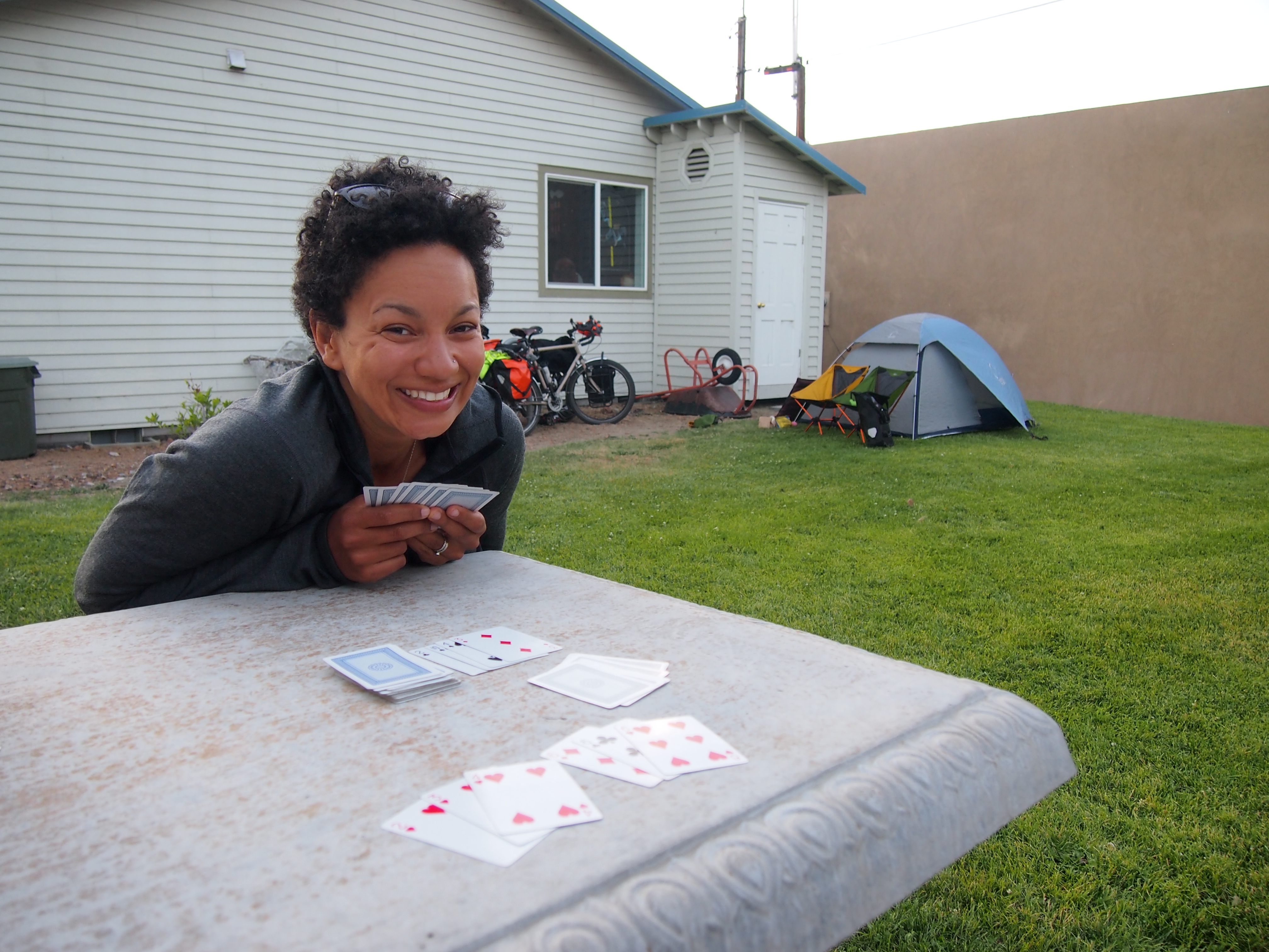 Before settling down for the evening in our private backyard, we tooled around town for a bit, picking up some groceries and grabbing dinner at the delicious local pizza joint, where I proved once and for all how hard-headed I am by standing up and shattering the low hanging light fixture with my head, much to the delight of all of the other patrons. The story has a tragic ending though. There were still three pieces of pizza left, and we had to throw them away because we didn’t want to accidentally eat shattered light fixture for dinner.