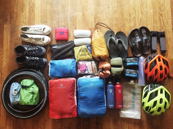 We’ll be traveling for three weeks, and we’re aiming to pack extremely light for a few reasons: 1) I am suuuuuper out of shape and unsure if I’m even still capable of riding 60 miles, let alone with a bunch of stuff, 2) we will take a lot of different forms of transportation on this trip (multiple planes, minibuses, charter buses), and we learned from our time as Peace Corps volunteers in Zambia that having minimal stuff makes getting around this way a thousand times easier, and 3) we are cheap and don’t want to pay for extra checked luggage.