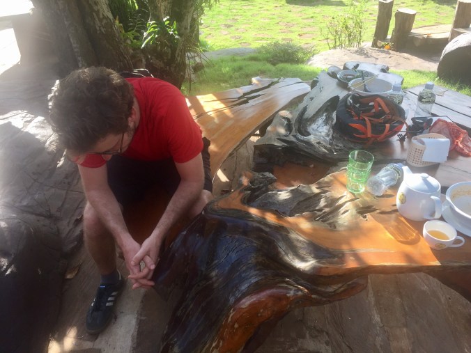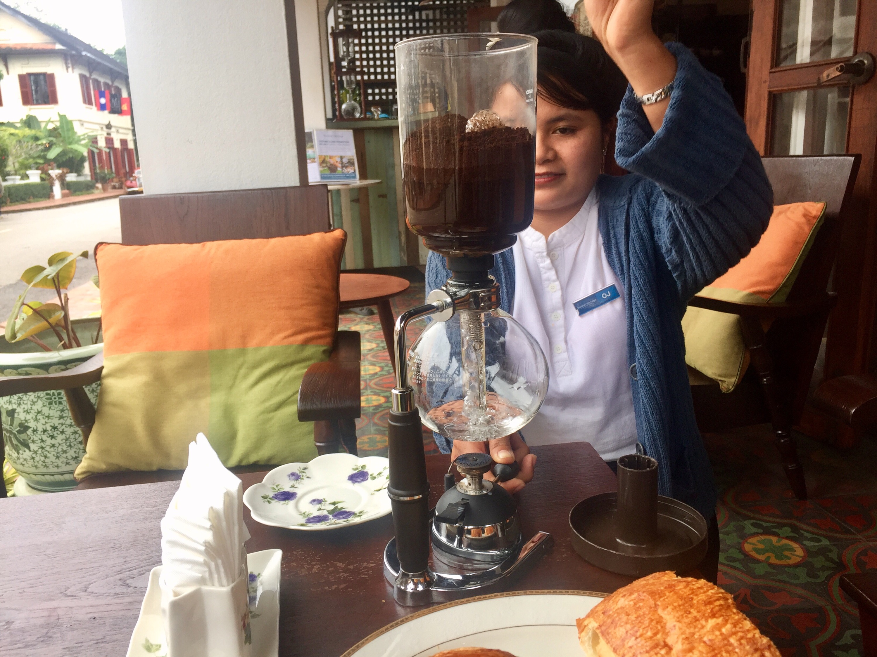Bonus day in Luang Prabang! We didn’t want to pack too much into the day; we wanted to relax and wander and simply enjoy one last day in this city we’ve come to love. We slept in until 9 or so, showered, and headed up to the Chang Inn, where we sat on the porch swing, ate chocolate croissants, drank siphon coffee (so cool – see below), and people watched.